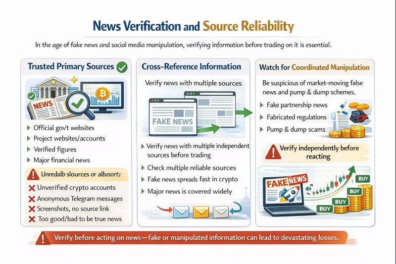 Watch for Coordinated Manipulation where false news is intentionally spread to move markets. Pump and dump schemes often involve fake partnership announcements or fabricated regulatory news. Sophisticated manipulators create fake websites, press releases, and social media buzz to lend credibility to false information. If news seems designed to create FOMO or panic, be extra cautious. Verify independently before reacting.