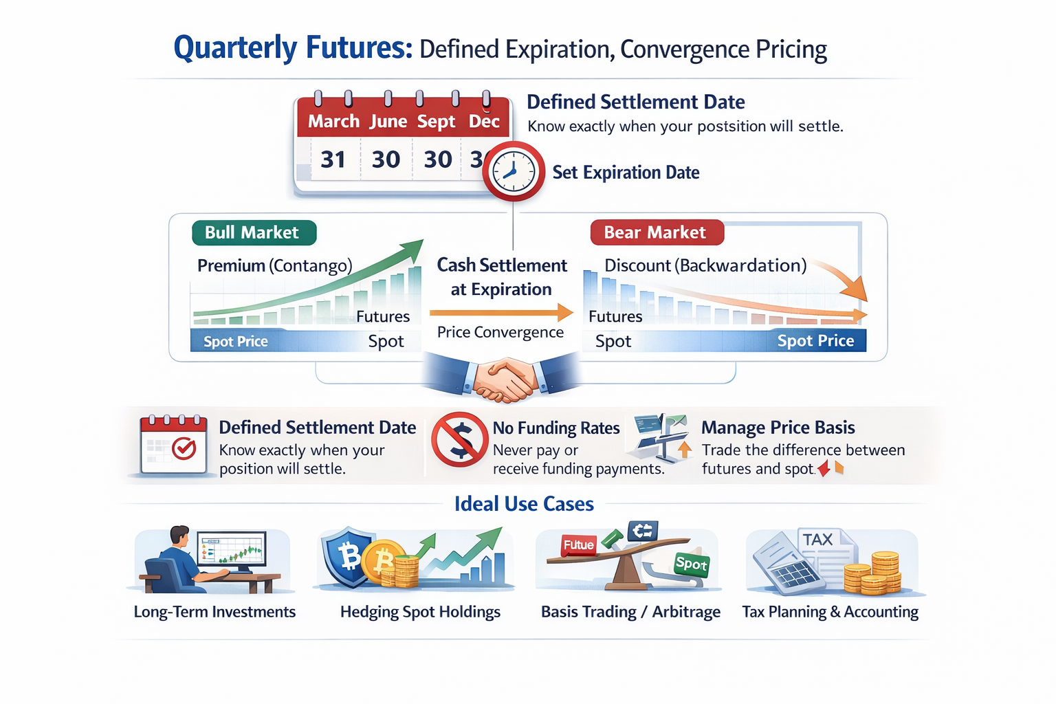 Seasonal Positioning: Bitcoin and crypto markets show some seasonal patterns (though less pronounced than in 2026's volatile environment). Using quarterly contracts allows you to position for expected trends (like year-end rallies or tax-loss selling) without paying daily funding.