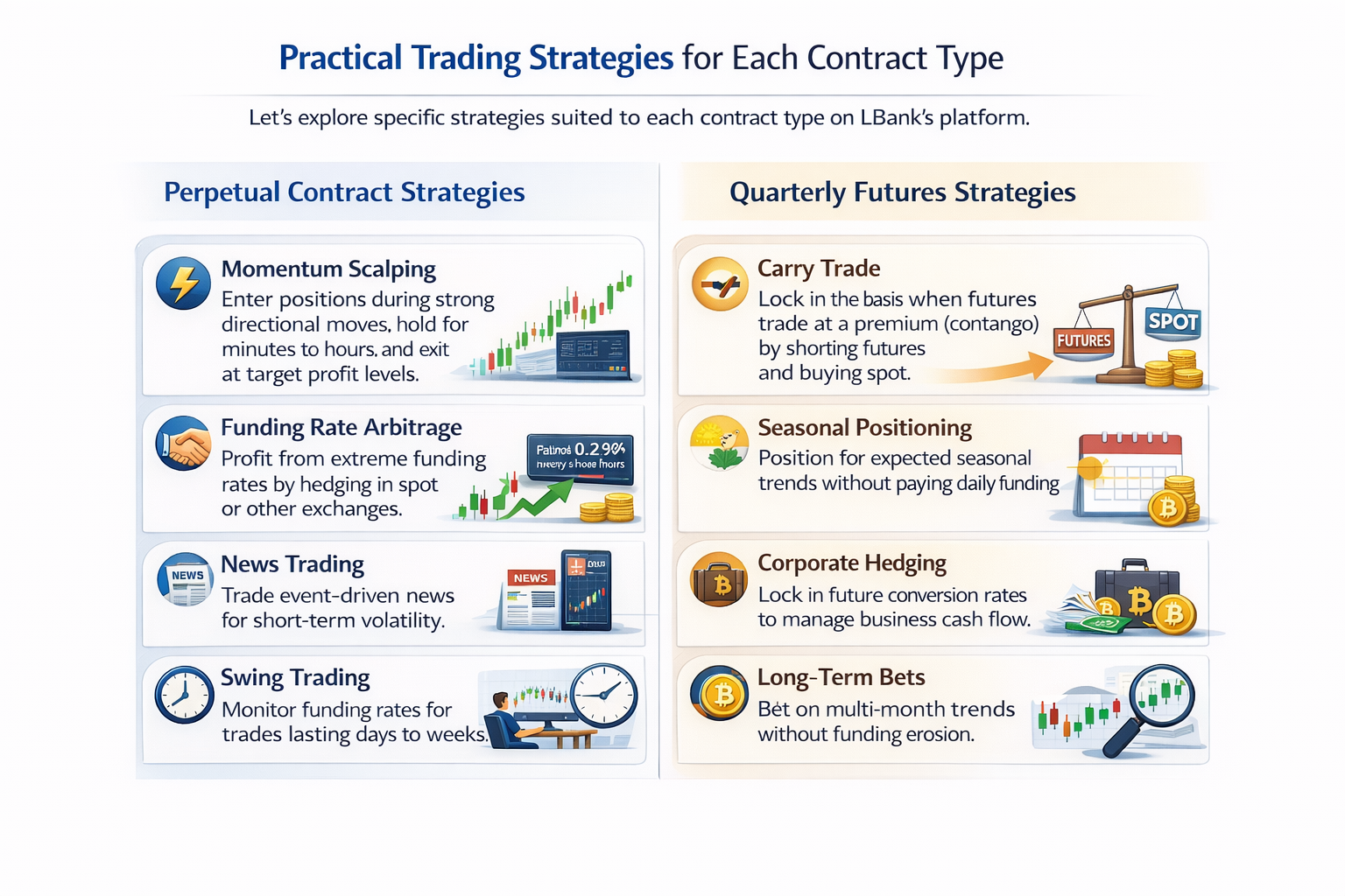 Let's explore specific strategies suited to each contract type on LBank's platform.