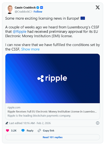 Ripple just unlocked access to the entire European Union. On February 2, Luxembourg's financial watchdog gave the company full approval to operate as an Electronic Money Institution across all 27 EU member states.