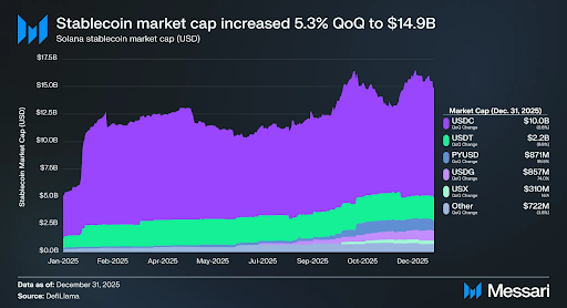 Pull back from the short-term data and a different picture emerges. Stablecoins on Solana reached an all-time high of $14.9 billion in Q4 2025, with USDC accounting for $10 billion of that.