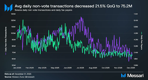 According to Messari’s latest report, fewer people are using the Solana network compared to a few months ago. Daily fee payers dropped nearly 20% quarter-over-quarter in Q4 2025, and non-vote transactions fell by a similar margin.
