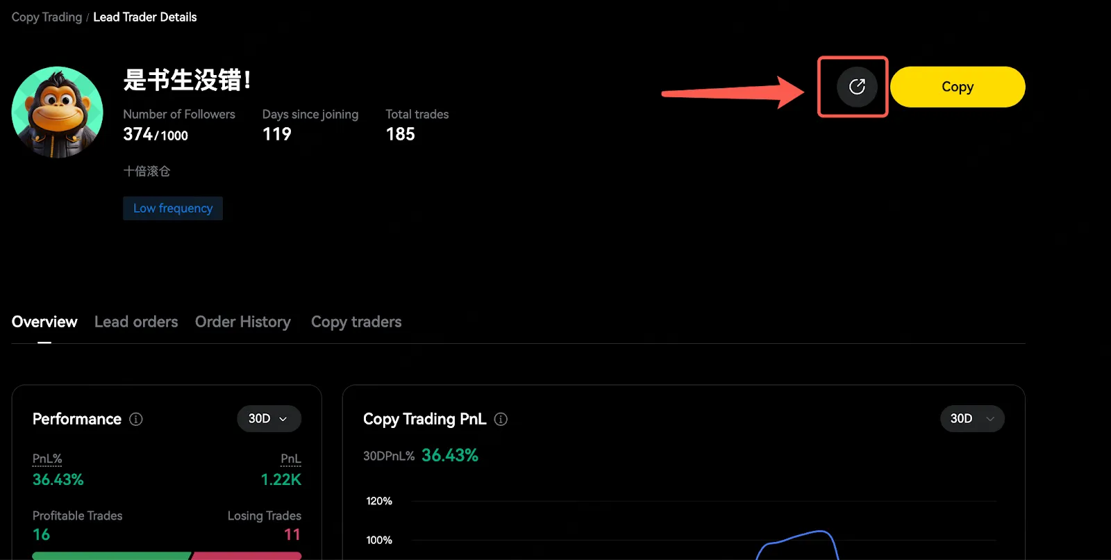 Klicke auf der Copy-Trading-Seite auf einen der Teilen-Buttons, um deinen exklusiven Kurzlink mit nur einem Klick zu versenden und deine Freunde schnell zur Teilnahme einzuladen.