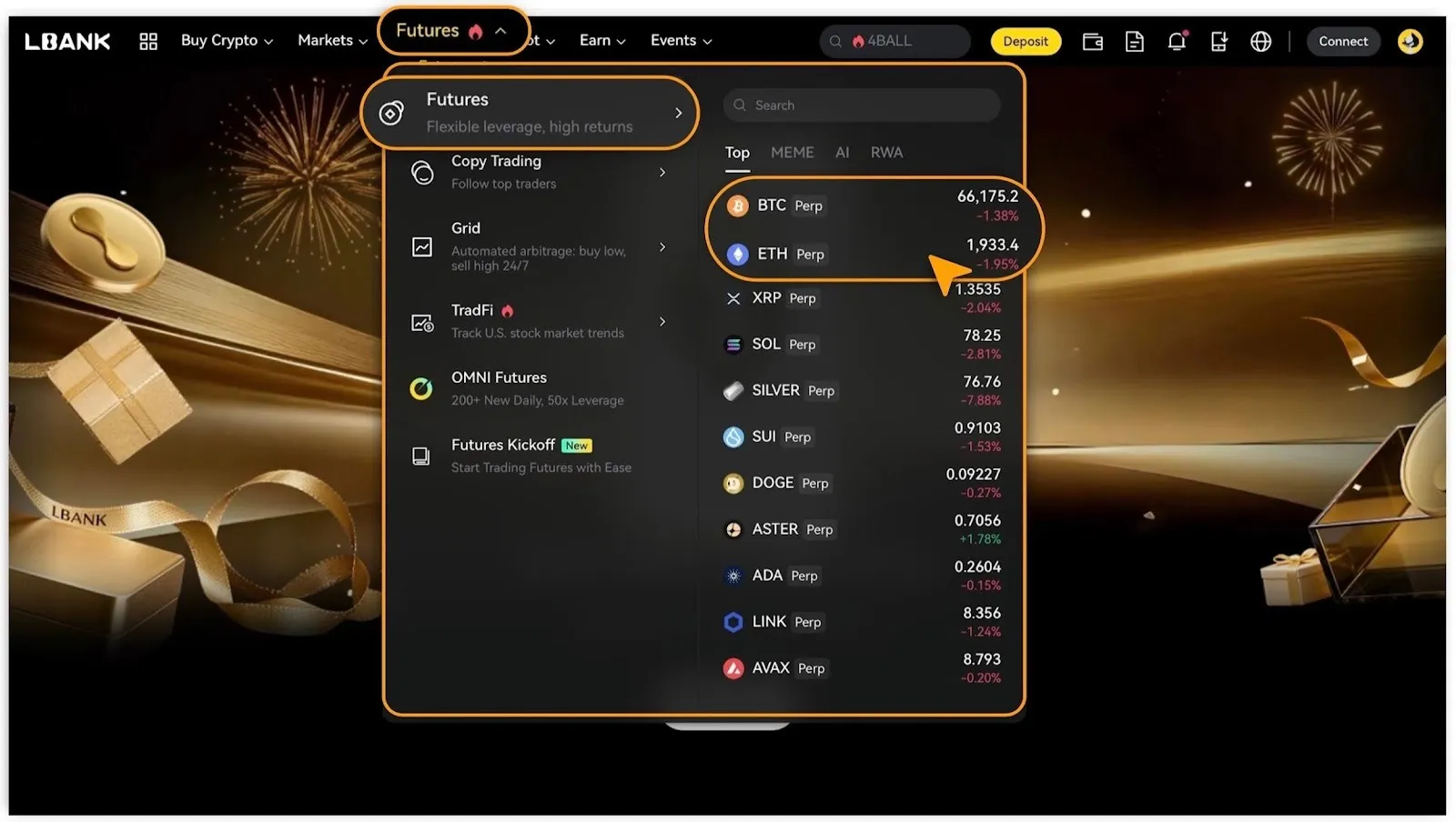 Navigieren Sie auf der Startseite zu „Futures🔥“ und wählen Sie ein Handelspaar aus (z. B. BTC oder ETH).