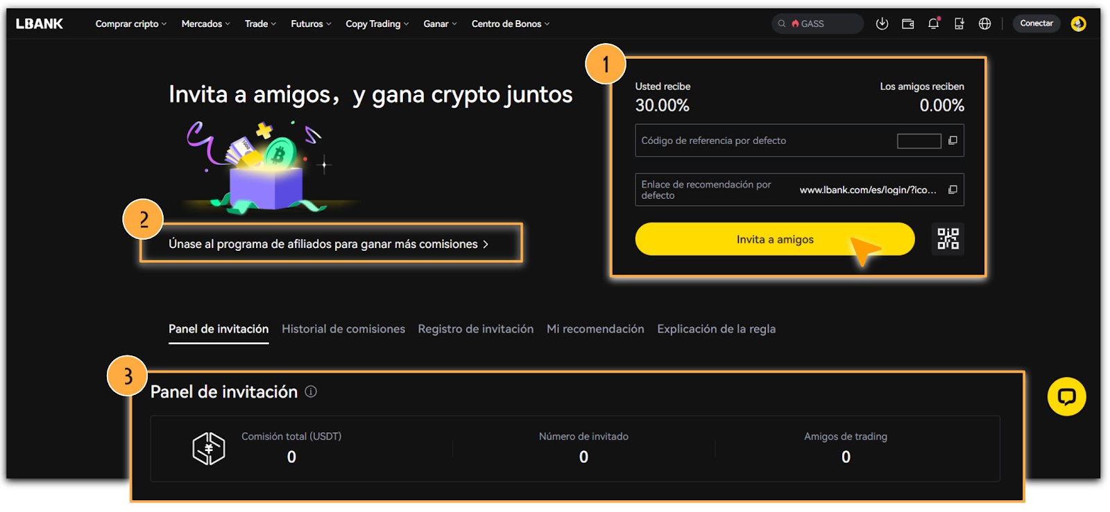 Después de invitar exitosamente a nuevos usuarios a registrarse en LBank, el invitador puede ganar una comisión de las tarifas de trading pagadas por los nuevos usuarios en el mercado spot.