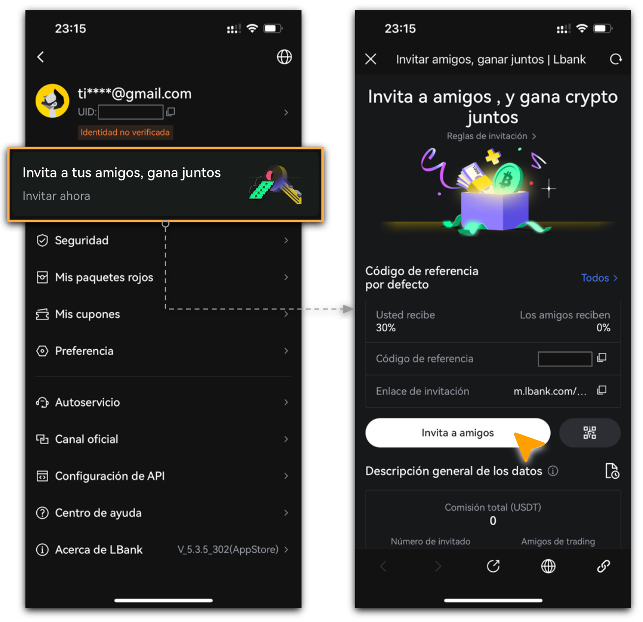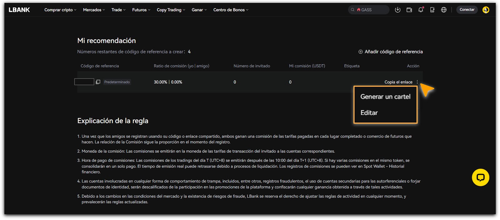 - El código de referido debe ser ingresado durante el registro inicial de la cuenta en LBank.