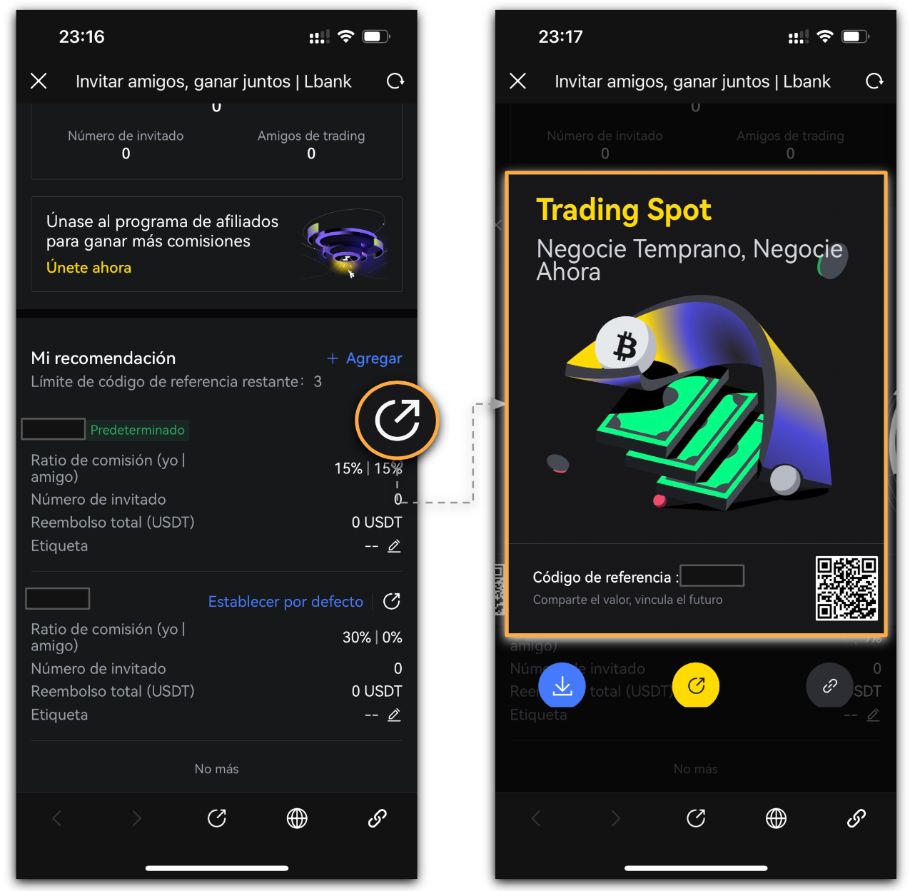 - Puedes copiar el [Código de referencia] o el [Enlace de invitación], y tocar [Invita a amigos] para obtener cartel compartibles.
