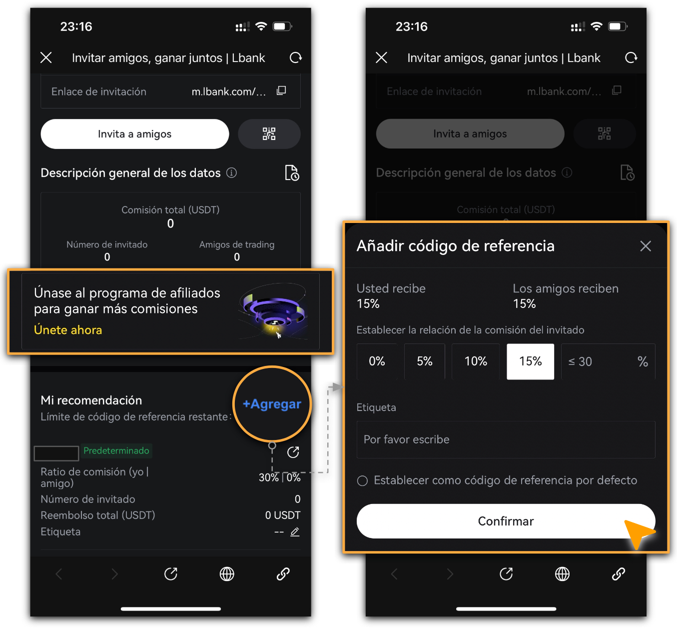 - Configura la [Relación de la comisión], deja una observación en [Etiqueta] y toca [Confirmar].