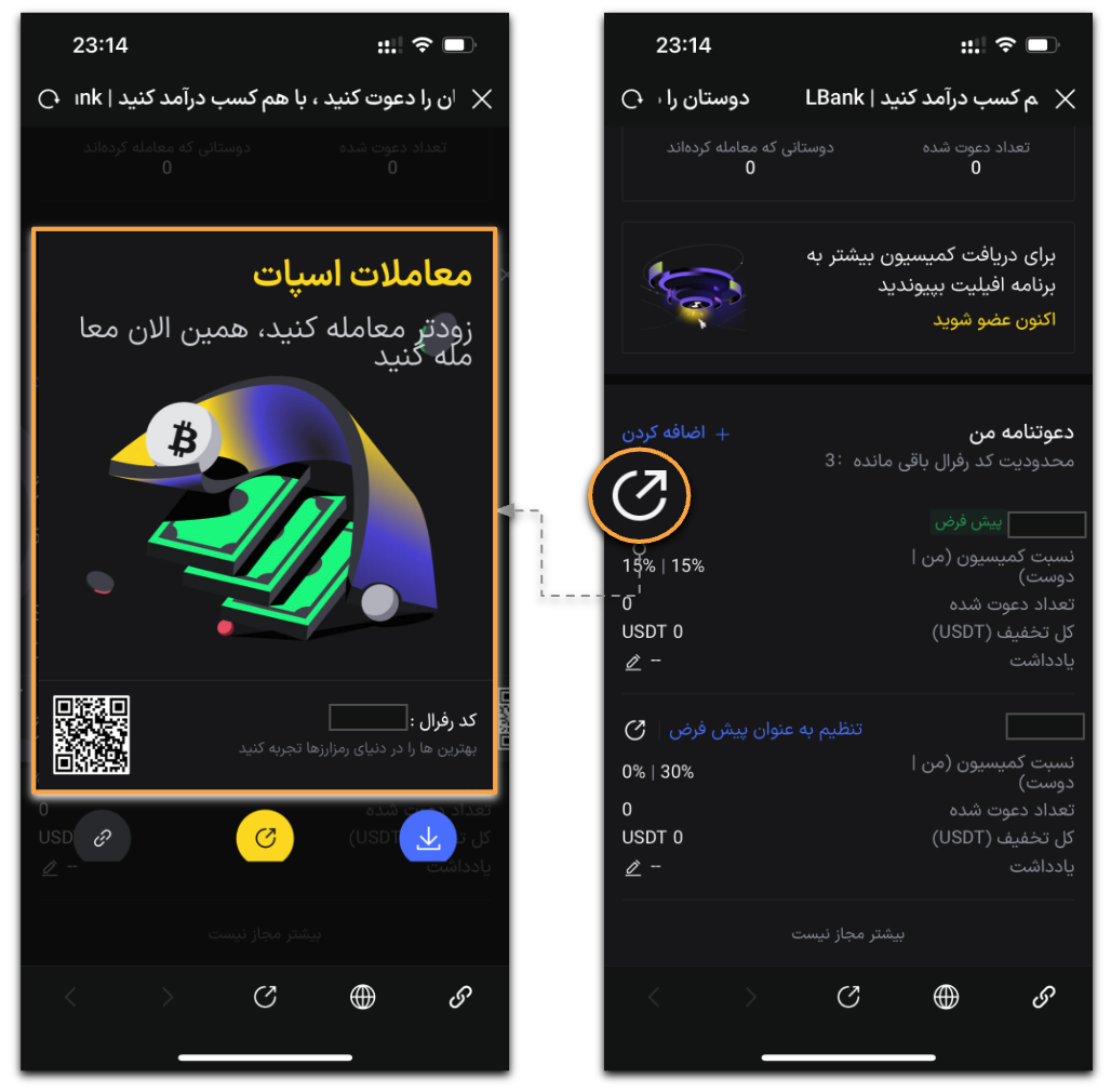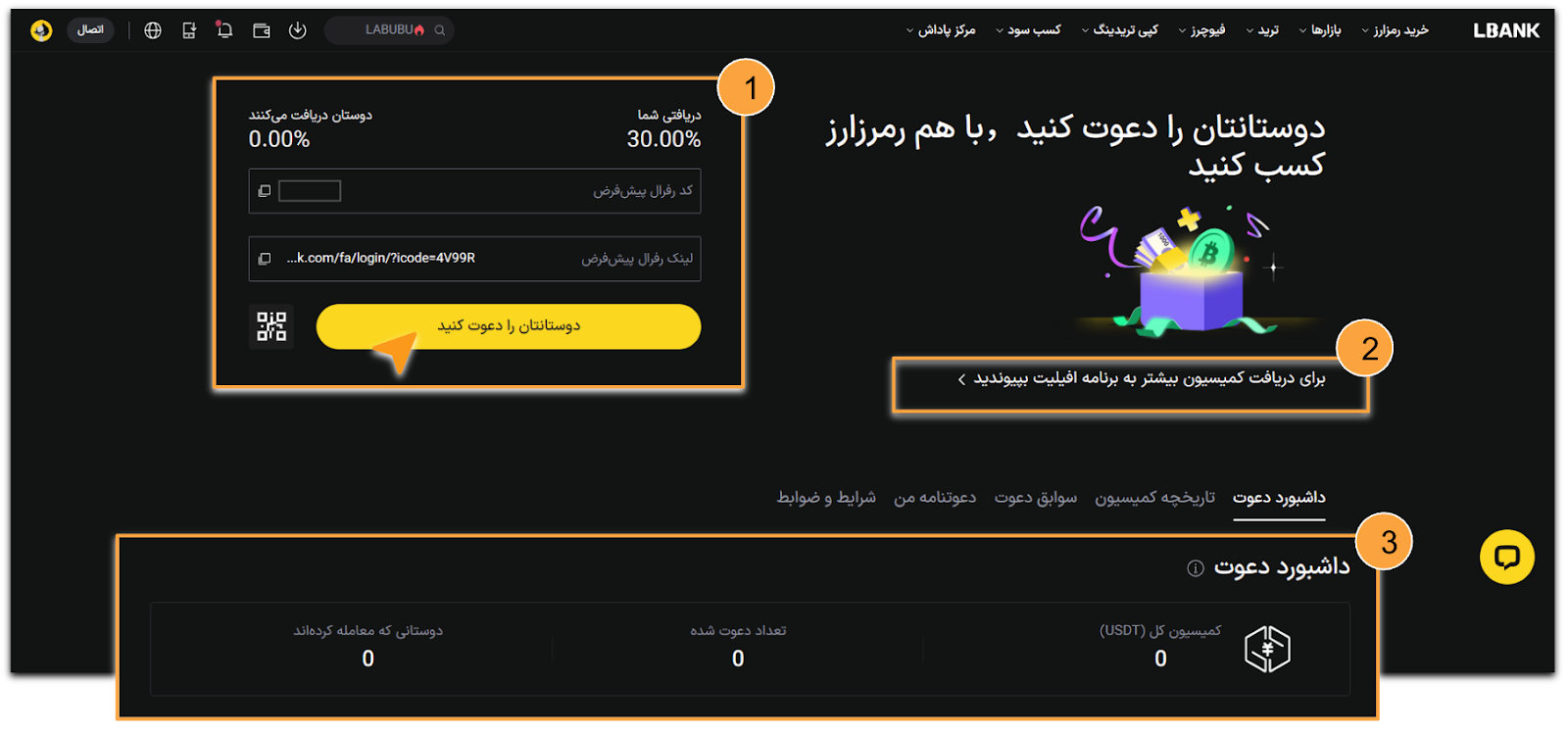 پس از دعوت موفقیتآمیز کاربران جدید برای ثبتنام در LBank، دعوتکننده میتواند کمیسیونی از کارمزد معاملات کاربران جدید در بازار اسپات دریافت کند.