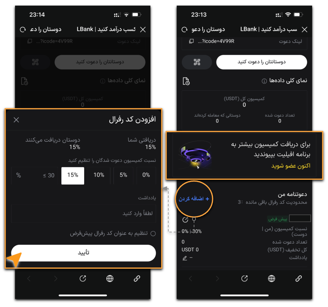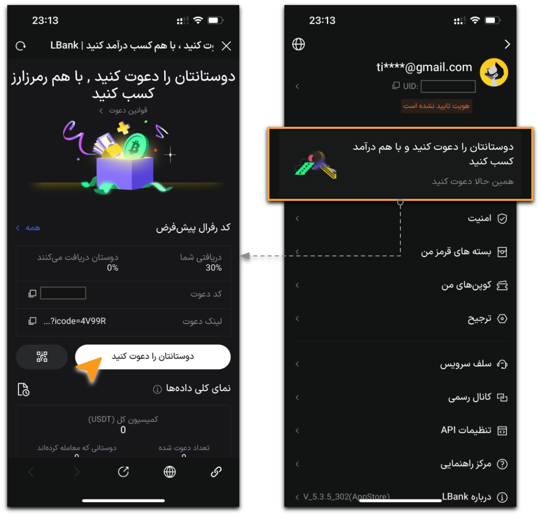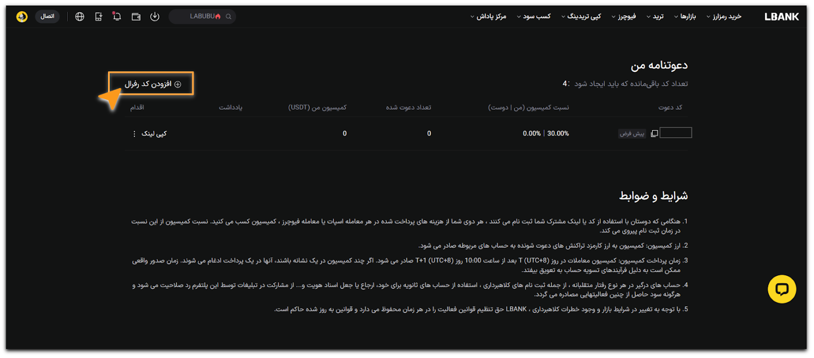 ۱. کد رفرال باید در زمان ثبتنام اولیه حساب کاربری LBank وارد شود.