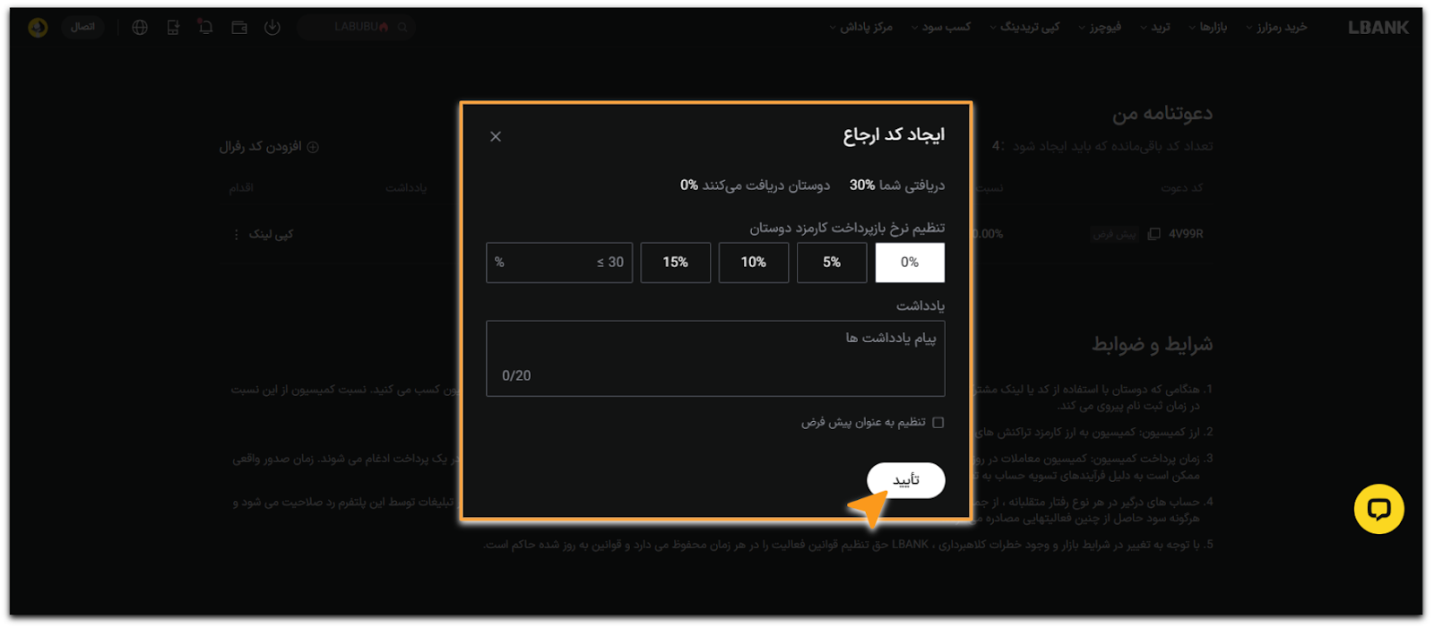 ۷. نرخ رفرال [بازپرداخت کارمزد] را تنظیم کرده، یادداشت دلخواه را در بخش [یادداشت] وارد کرده و روی [تأیید] بزنید.