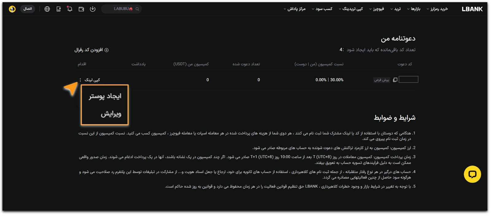 ۴. علاقهمند به برنامه همکاری افیلیت (Affiliate Program) هستید؟ برای کسب اطلاعات بیشتر کلیک کنید یا به آدرس زیر بروید: 👈 https://www.lbank.com/fa/affiliate-program