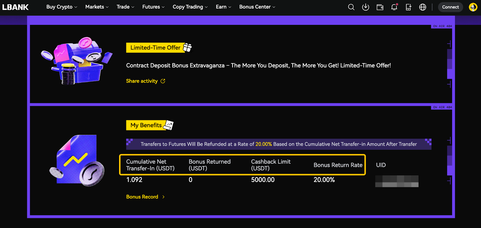 بونوس فیوچرز یک پاداش ویژه است که از طریق فعالیتهای عملیاتی و تبلیغاتی مختلف به کاربران اعطا میشود. برخلاف سرمایه واقعی، این بونوس به عنوان سرمایه تجربی به حساب فیوچرز USDT کاربران واریز شده و فقط برای معاملات فیوچرز قابل استفاده است. این بونوس را نمیتوان به کیف پول اسپات منتقل کرد یا برداشت نمود.