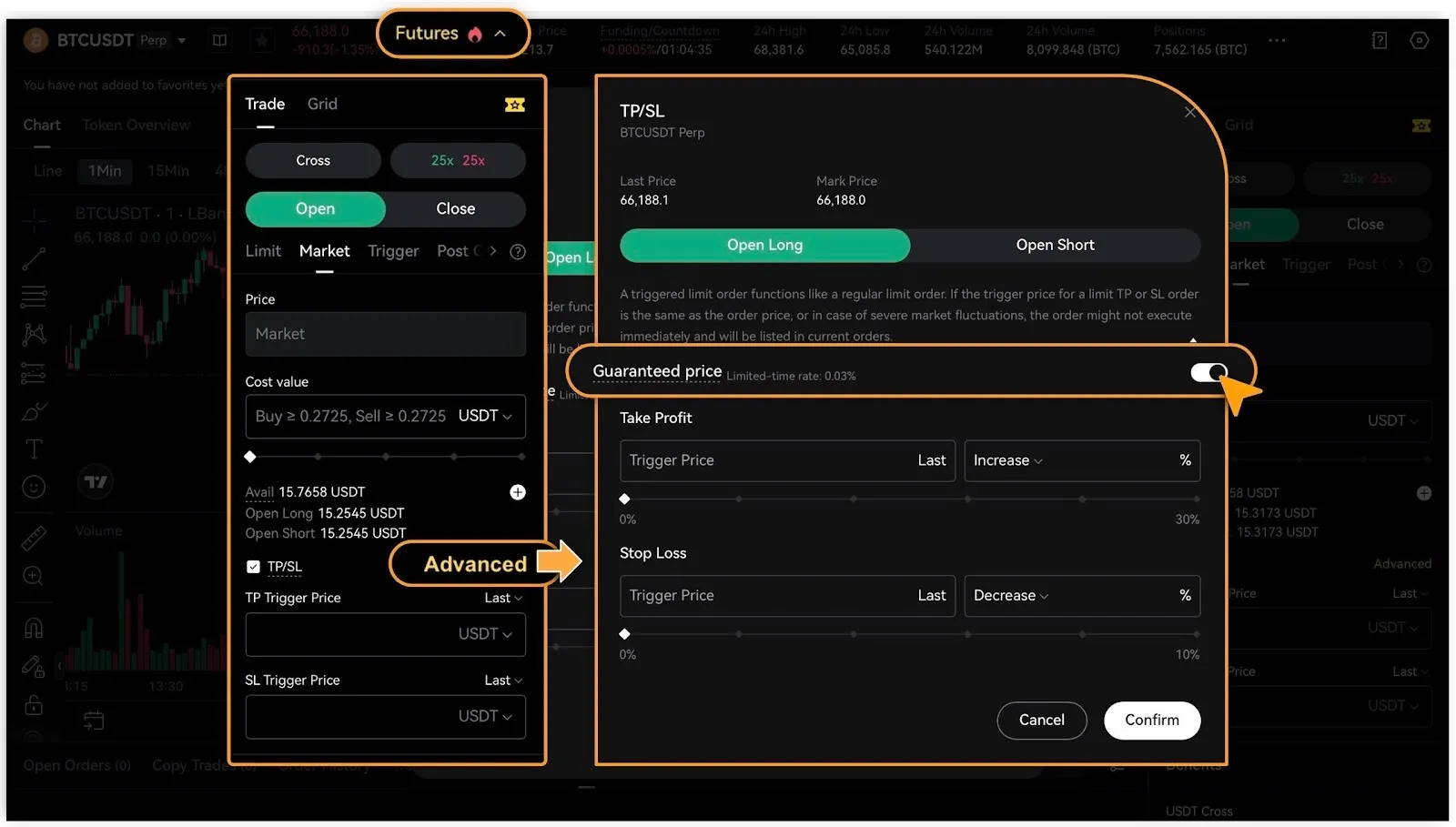 Le TP/SL standard peut être exécuté à un prix significativement différent du prix de déclenchement en cas de faible liquidité ou de forte volatilité. Le TP/SL garanti vise à exécuter l’ordre à un prix non moins favorable que le prix de déclenchement lorsque les conditions sont remplies, mais entraîne des frais supplémentaires de prix garanti.