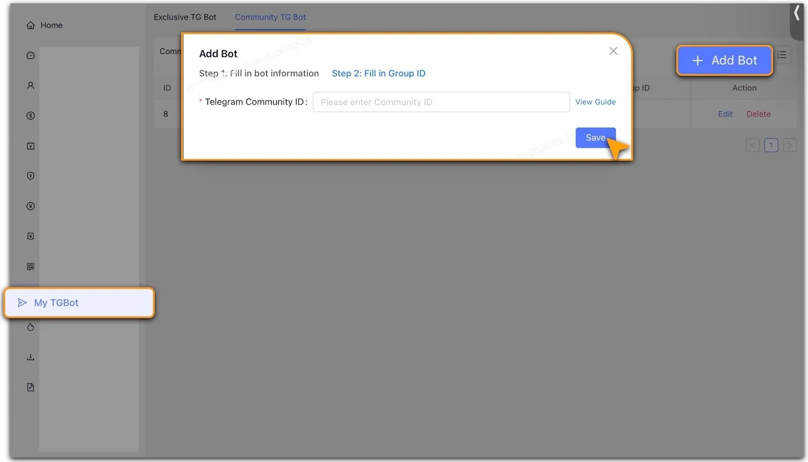 Ensuite, accédez à [Bot TG communautaire] et cliquez sur [+ Ajouter un bot] pour en créer un nouveau.