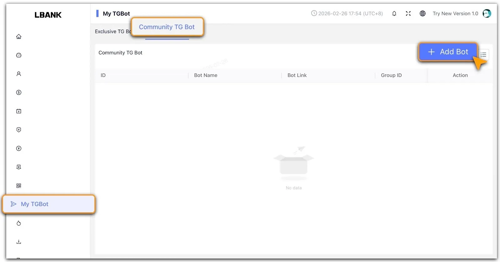 Buka「TG Bot Komunitas」, lalu klik「+ Tambah Bot」untuk membuat yang baru.