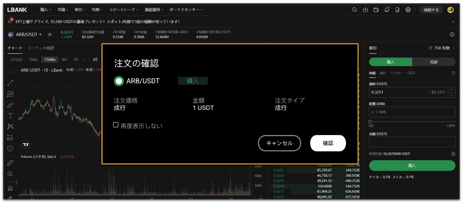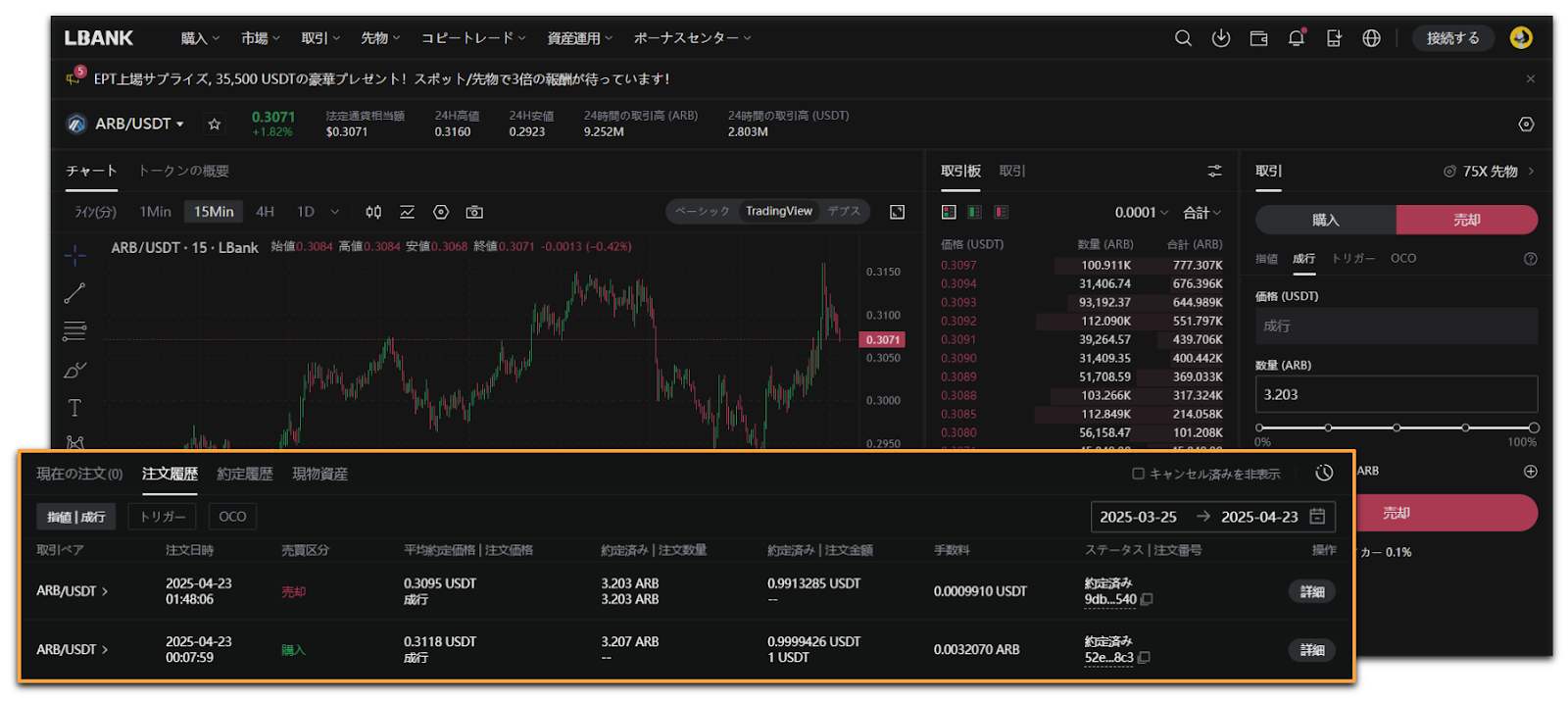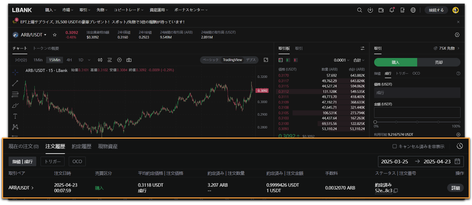 - 購入注文が正常に処理されると、チャートの下に注文履歴が表示されます。