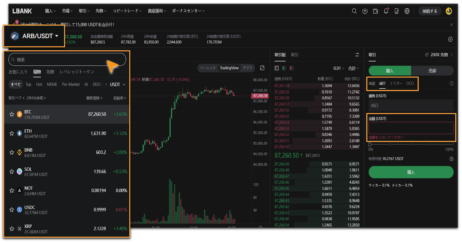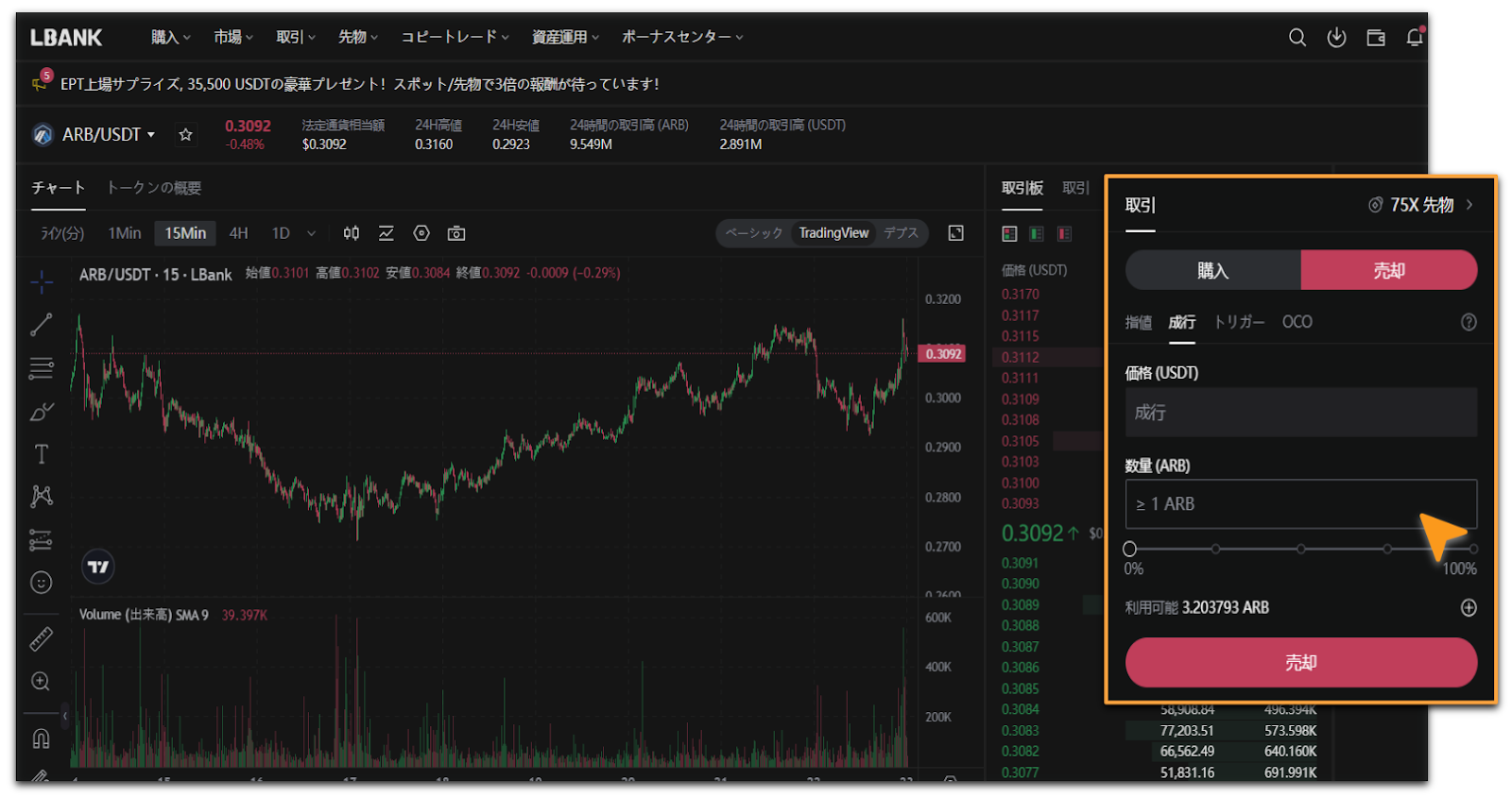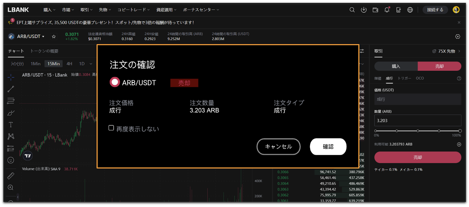- 購入注文が正常に処理されると、チャートの下に注文履歴が表示されます。
