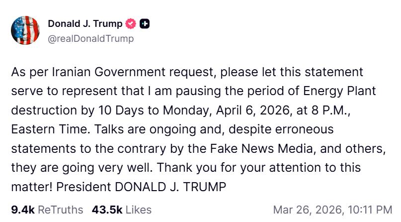 On Thursday, US President Donald Trump announced an extension to the ceasefire on Iranian energy infrastructure by 10 days to April 6, citing constructive ongoing negotiations.