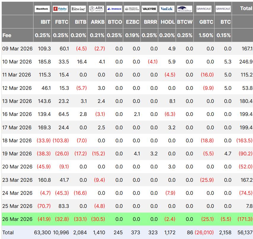 BlackRock’s iShares Bitcoin Trust ETF (IBIT) led the outflows with $41 million, Fidelity’s Wise Origin Bitcoin Fund (FBTC) followed with $32 million, the ARK 21Shares Bitcoin ETF (ARKB) sold $30.5 million, and Grayscale’s Bitcoin Trust ETF (GBTC) sold $24 million, according to data from Farside Investors.