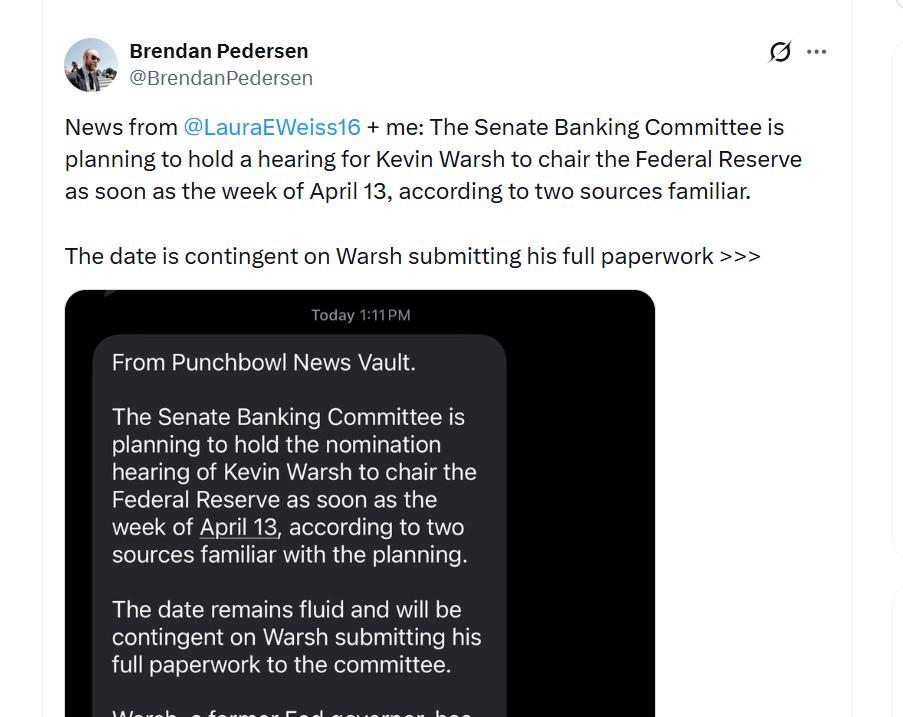 The Senate Banking Committee is reportedly planning to hold its hearing on the nomination of Kevin Warsh as Federal Reserve chair as soon as the week of April 13, according to a report from Punchbowl News citing two sources familiar with the matter.
