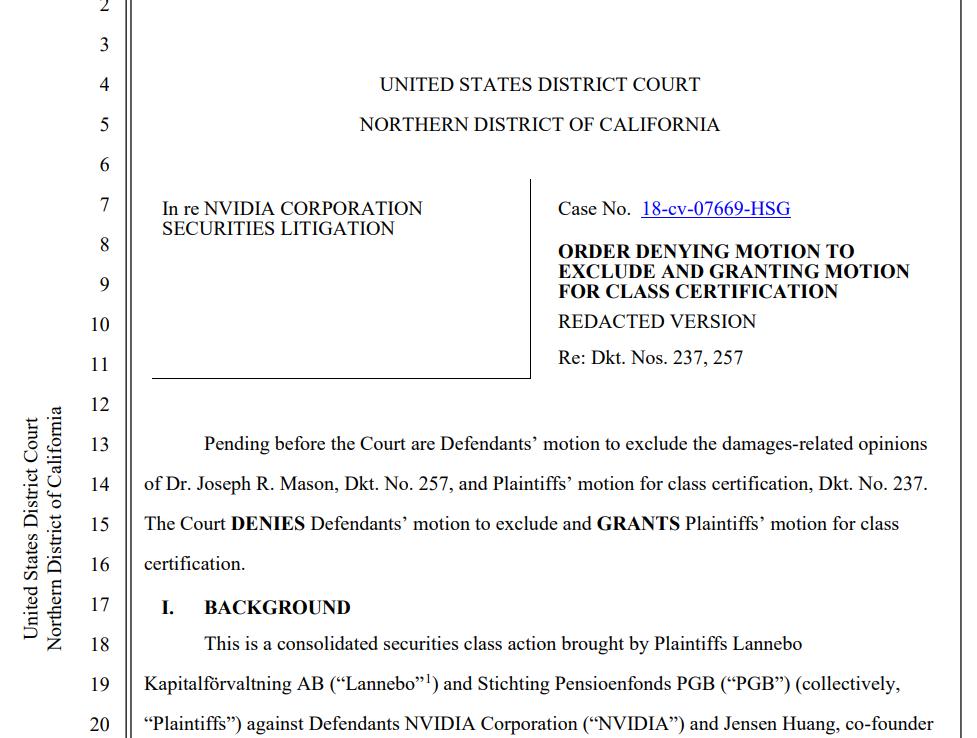 A California federal judge has certified an investor class in a securities lawsuit accusing Nvidia and CEO Jensen Huang of misleading shareholders about how much of the company’s gaming revenue during the 2017-2018 crypto mining boom came from GPU sales to cryptocurrency miners.