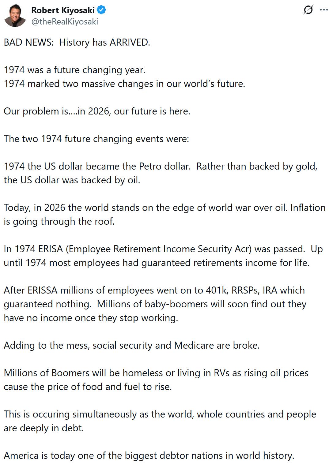 “The future created in 1974 has arrived,” Kiyosaki wrote, linking current inflation and geopolitical tensions around energy to the dollar’s evolution after the end of the gold standard era. He also mentioned the passage of the Employee Retirement Income Security Act, which introduced new rules for pension plans and coincided with a broader shift toward market-based retirement savings.