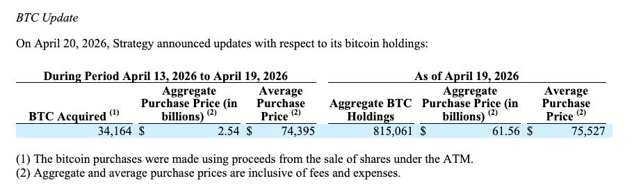 Strategy acquired 34,164 Bitcoin (BTC) for $2.54 billion between April 13 and 19, according to an 8-K filing with the US Securities and Exchange Commission on Monday.