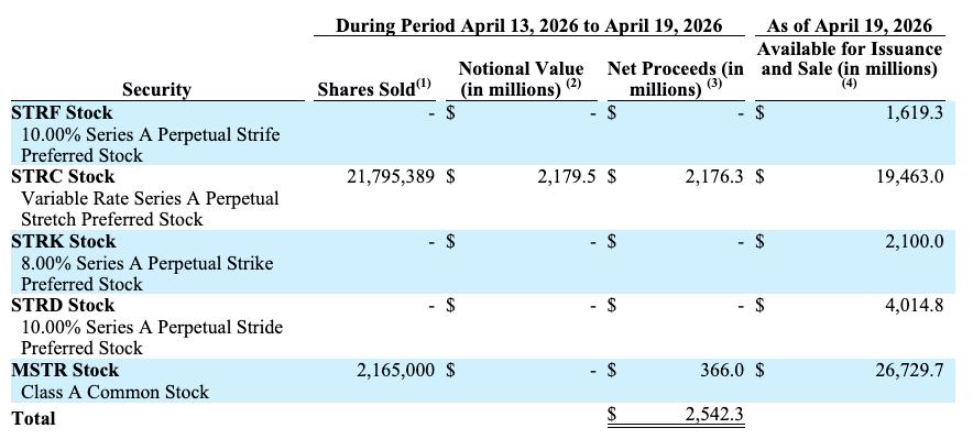 According to the filing, STRC generated $2.18 billion, or about 85.7% of total proceeds, while sales of Class A common stock (MSTR) contributed $366 million.