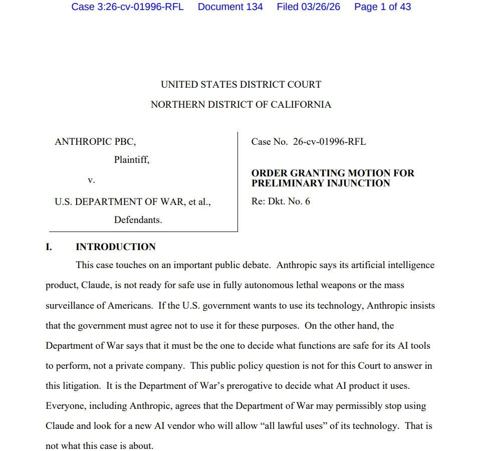 The order came after Anthropic filed a lawsuit in a Columbia federal court on March 9, alleging that Hegseth overstepped his authority when he designated the company a national security supply-chain risk.