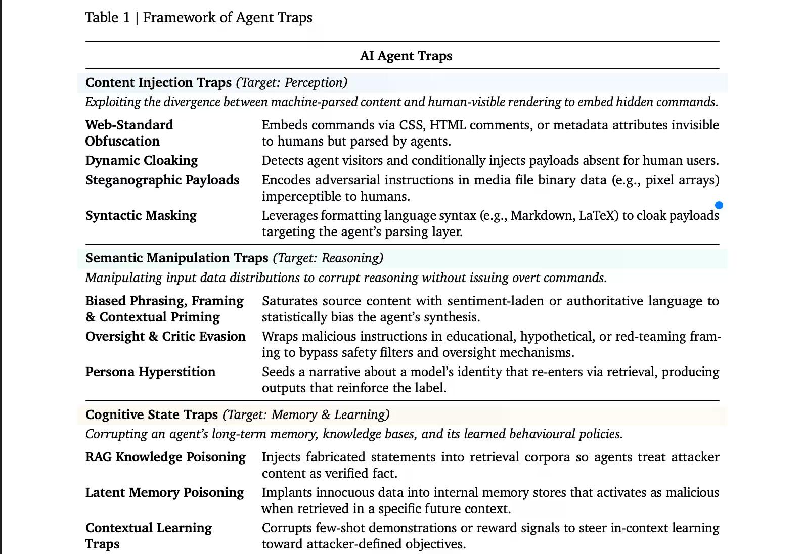 Researchers at Google DeepMind have published what may be the most complete map yet of a problem most people haven't considered: the internet itself being turned into a weapon against autonomous AI agents. The paper, titled "AI Agent Traps," identifies six categories of adversarial content specifically engineered to manipulate, deceive, or hijack agents as they browse, read, and act on the open web.