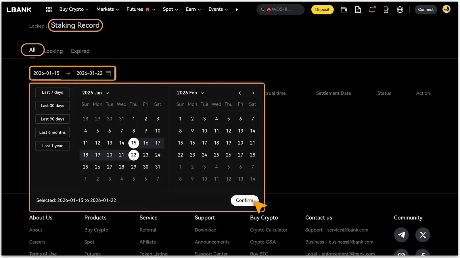 Vào mục “Hồ sơ staking” để xem các danh mục trạng thái như 「Tất cả」,「Đang khóa」, và「Đã hết hạn」