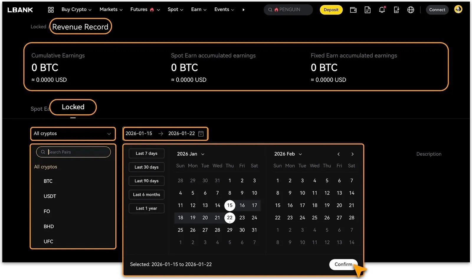 Xem chi tiết bao gồm 「Thu nhập tích lũy tương đương」, 「Thu nhập tích lũy từ Spot Earn」 và 「Thu nhập tích lũy từ staking thời hạn cố định」trên bảng điều khiển phía trên.