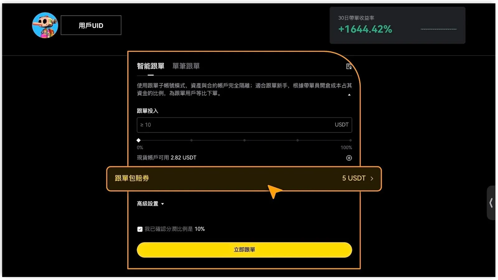 示例:您持有一張面值 10 USDT 的「跟單包賠券」。