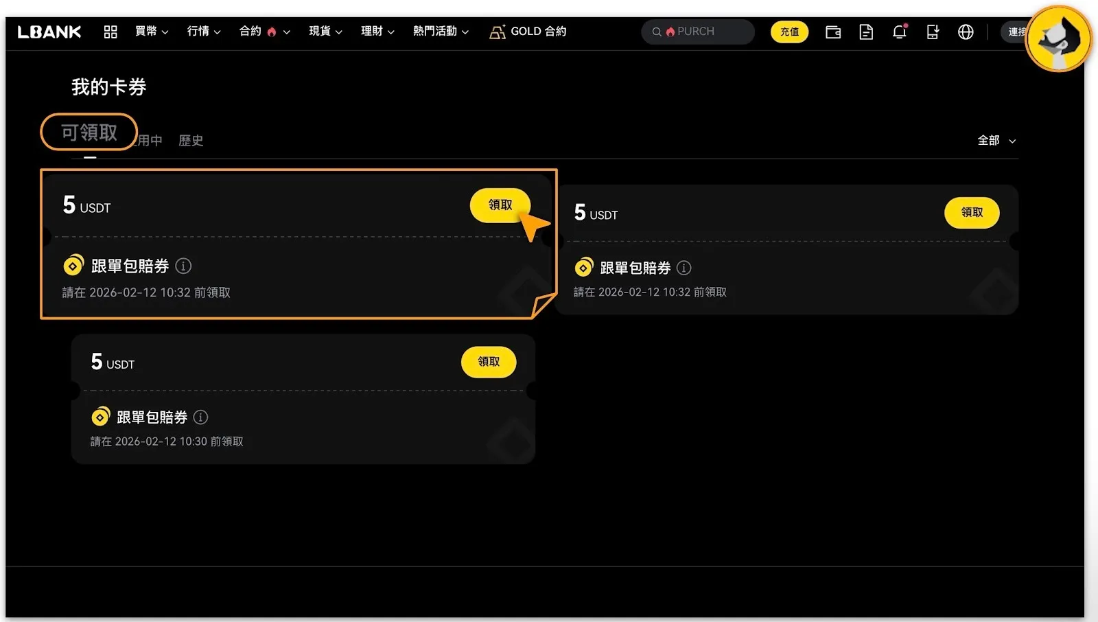 領取入口一:用戶導航至「個人中心」>「我的卡券 > 可領取」激活跟單包賠券;