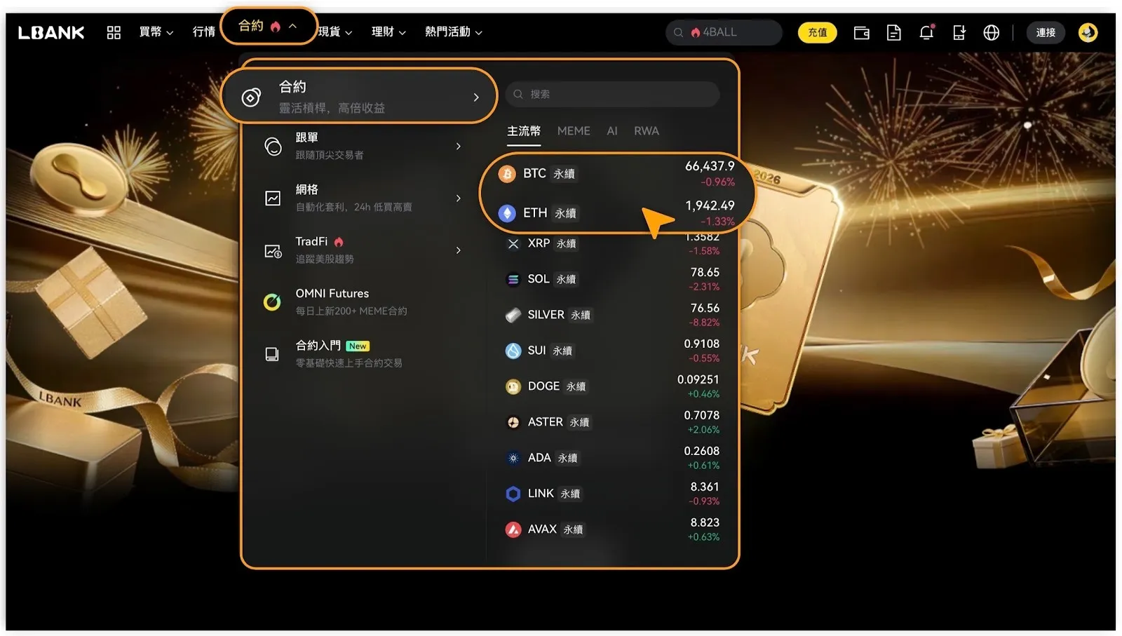 首頁導航欄點擊「🔥合約」,選擇BTC或ETH進行交易;