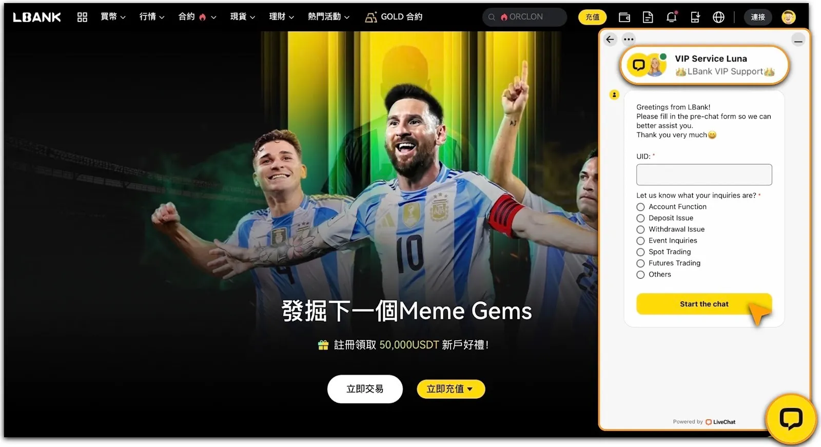 或點擊頁面右下方黃色懸浮按鈕,啟用VIP專屬客服對話框,專屬客服LUNA將提供實時支援。
